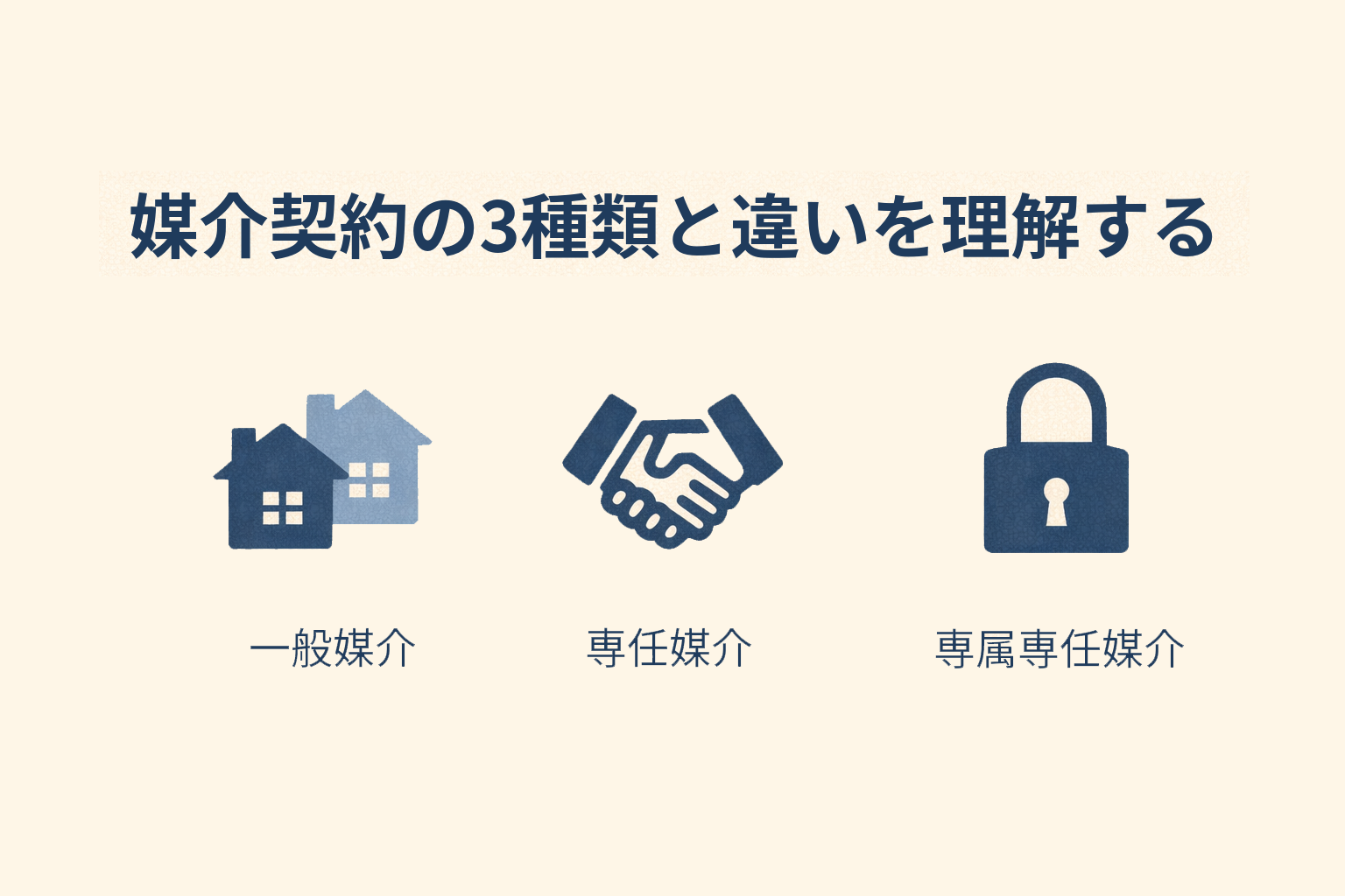 媒介契約とは、売主が不動産会社に対して「買主探しを依頼するための契約」です。売却価格や販売方法そのものを決める契約ではなく、あくまで「どのような条件で仲介を任せるか」を定めるものになります。宅地建物取引業法では、媒介契約を次の3種類に分けて規定しています。